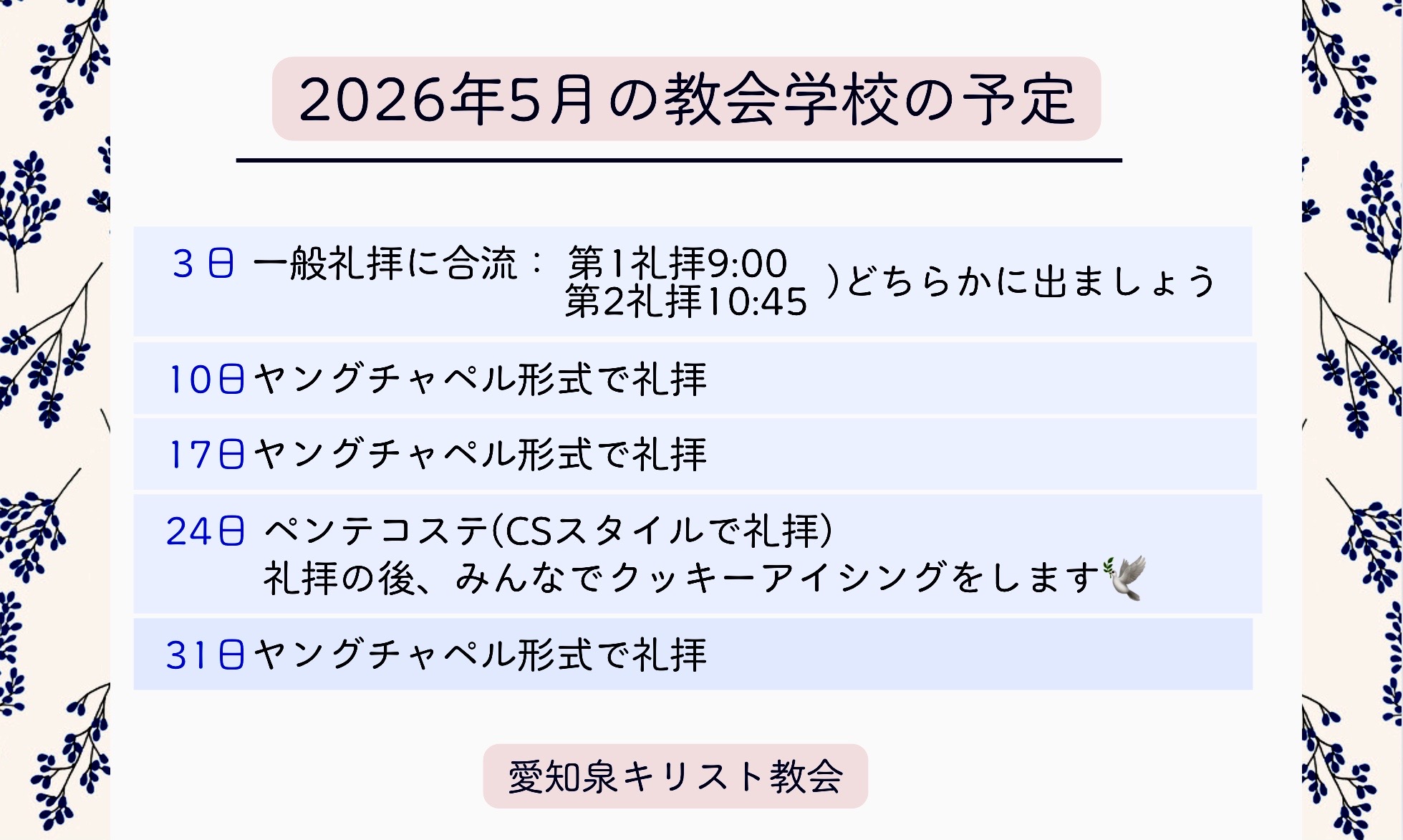 「2026年5月の教会学校の予定」 3日 一般礼拝に合流:第1礼拝9:00・第2礼拝10:45 (どちらかに出ましょう) 10日 ヤングチャペル形式で礼拝 17日 ヤングチャペル形式で礼拝 24日 ペンテコステ🕊️(CSスタイルで礼拝)礼拝の後、みんなでクッキーアイシングをし ます(o^^o) 31日 ヤングチャペル形式で礼拝